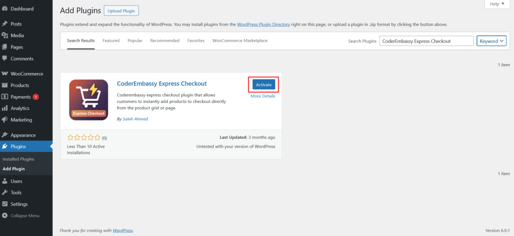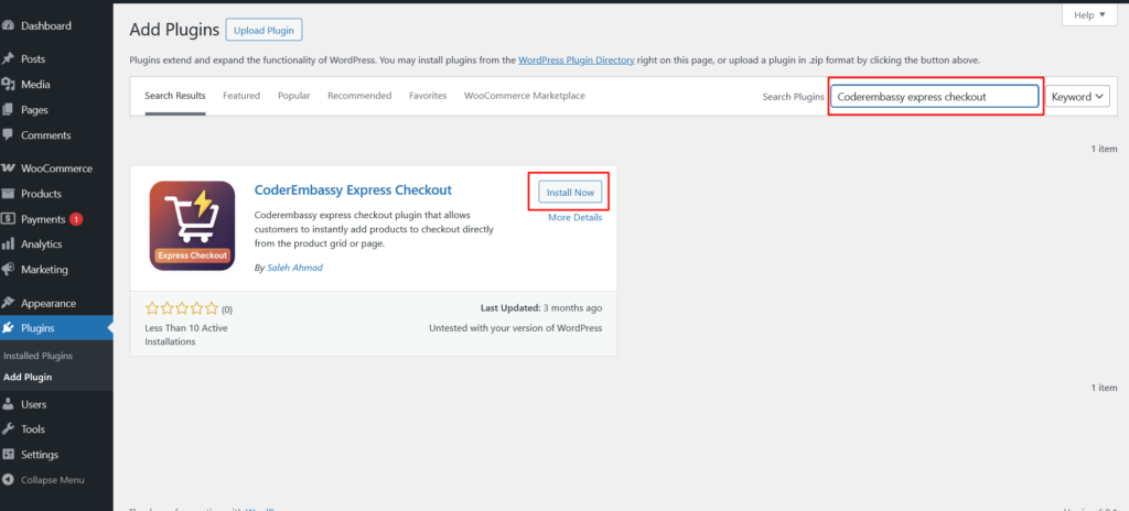 The free version of Coderembassy express checkout is available on the WordPress org. To install it, navigate to your WordPress dashboard, click on Plugins → Add New, and search for “Coderembassy Express checkout”