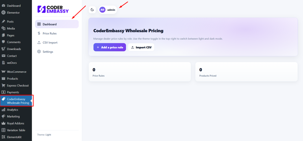 Coderembassy Wholesale pricing for WooCommerce plugin have a nice Admin Dashboard which user see it after installation and active plugin.