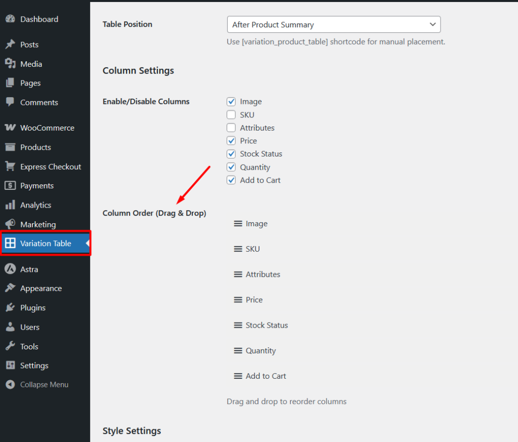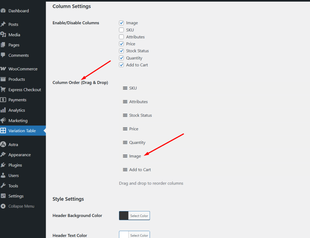 You can easily re-ordering variation product table columns from settings panel. check below steps